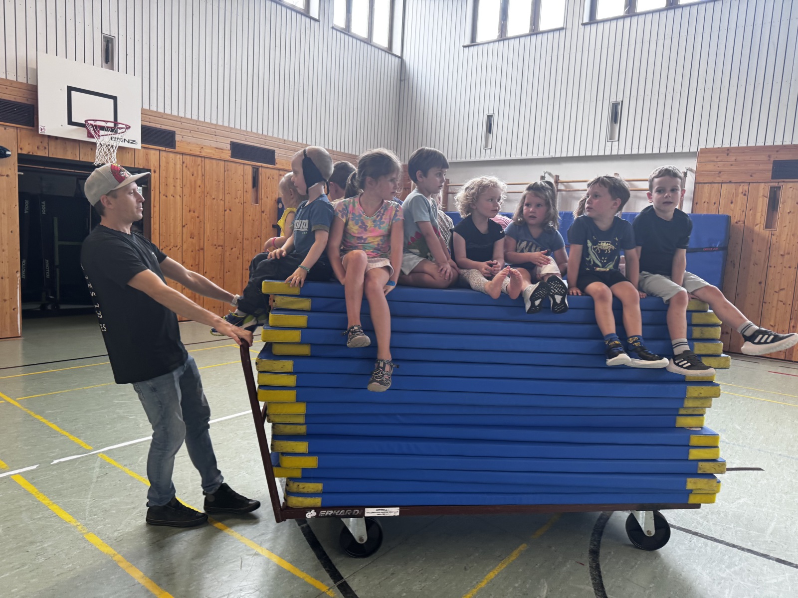 Ein besonderes Highlight und krönender Abschluss des Tages war die Fahrt auf einem Mattenwagen: Mit viel Begeisterung wurden alle Kinder durch die Turnhalle „gefahren“ und so endete der Wettkampftag mit einem großen gemeinsamen Spaßmoment.